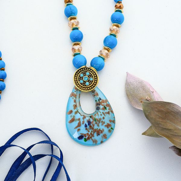 • Кулон восход "Муранское стекло" капля на бусах, цвет синий, 80 см