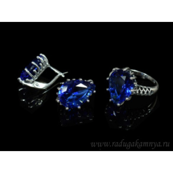 Кольцо и серьги с цирконом искусственным, цвет синий (иск.)