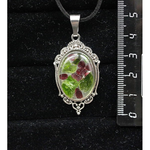 Кулон из хромдиопсида и граната (кабошон-мозаика), овал 25х18мм, оправа "медальон"