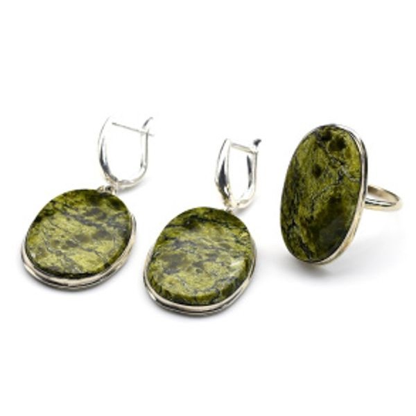 Кольцо и серьги змеевик треугольник 35х19мм швензы посеребрение р-р 19-20