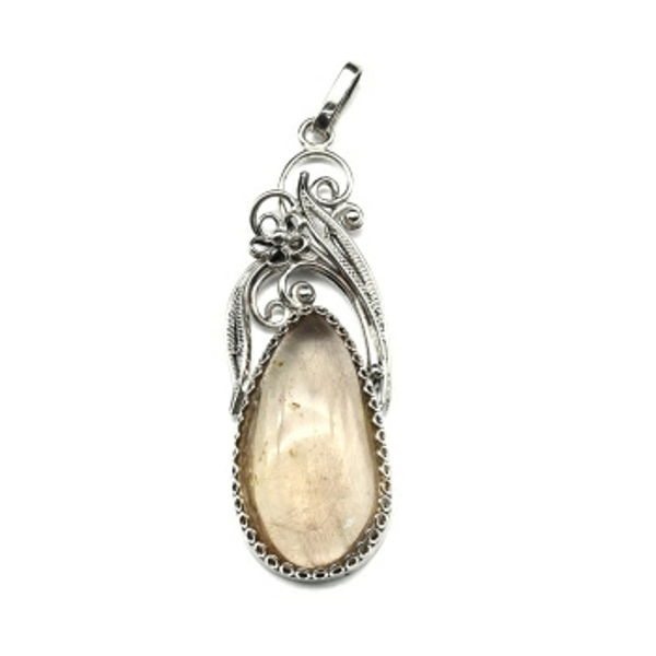 Брошь из кварца розового "вензель", основа 70х2.4мм, овал 18х13мм, подвеска горный хрусталь