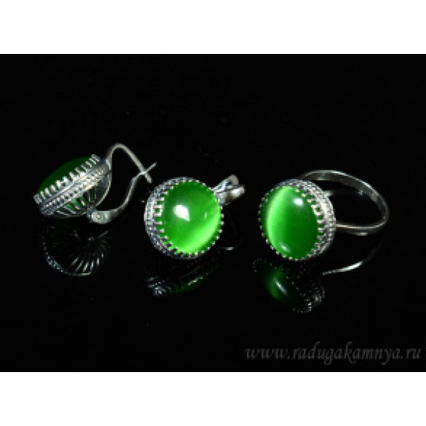 • Кольцо и серьги с кошачьим глазом, цвет зеленый