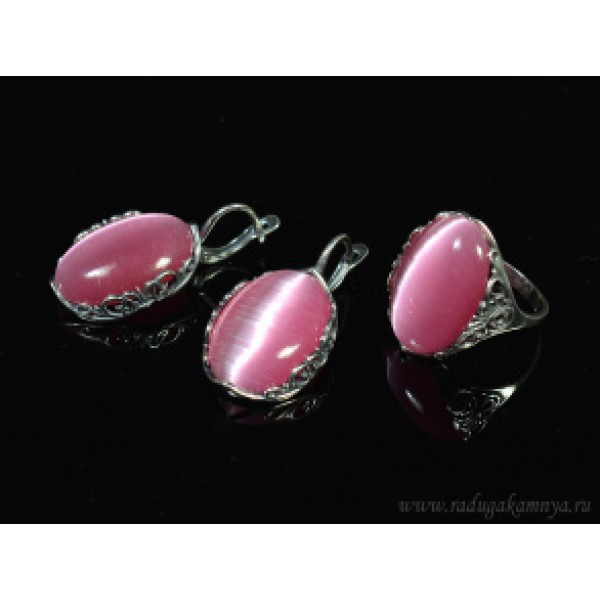 Кольцо и серьги с кошачьим глазом, цвет розовый