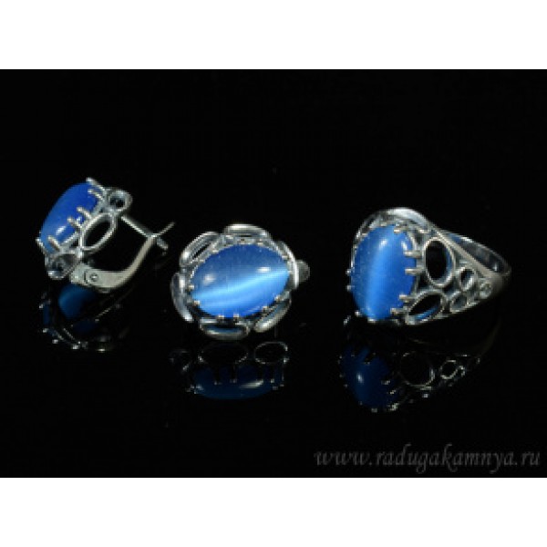 Кольцо и серьги с кошачьим глазом, цвет синий (иск.)
