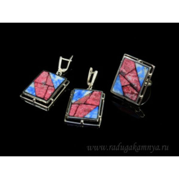 Кольцо и серьги мозаика "Прямоугольники" роденгита и лазурита