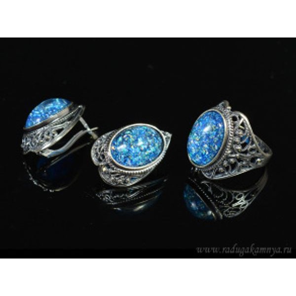 Кольцо и серьги с опалом искусственным, цвет голубой