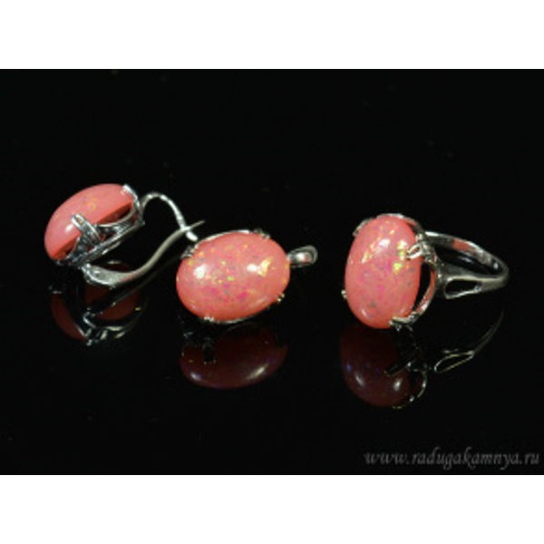 • Кольцо и серьги с опалом искусственным, цвет коралловый