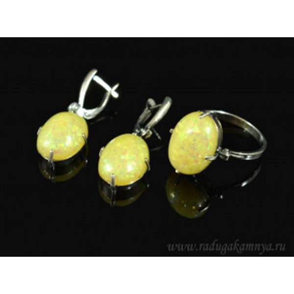 Кольцо и серьги с опалом искусственным, цвет лимонный