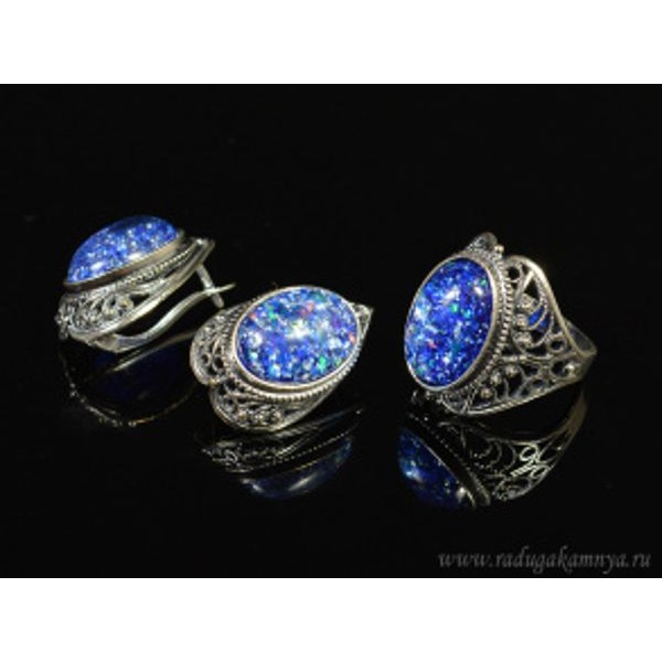 Кольцо и серьги с опалом искусственным, цвет синий