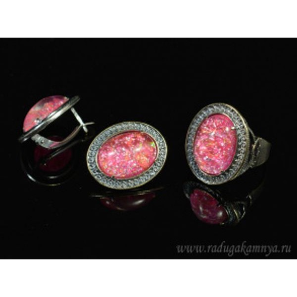 • Кольцо и серьги с опалом искусственным, цвет фуксия