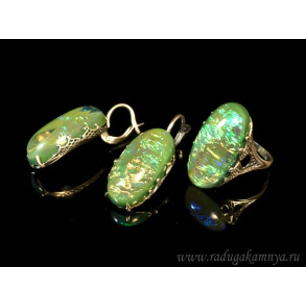 Кольцо и серьги с опалом искусственным, цвет зеленый (иск.)