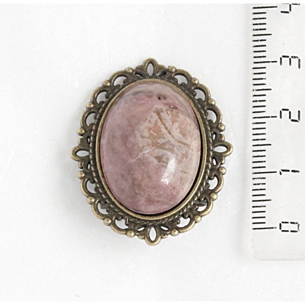 Брошь из родонита, овал 25х18мм, оправа с узором цвет бронза