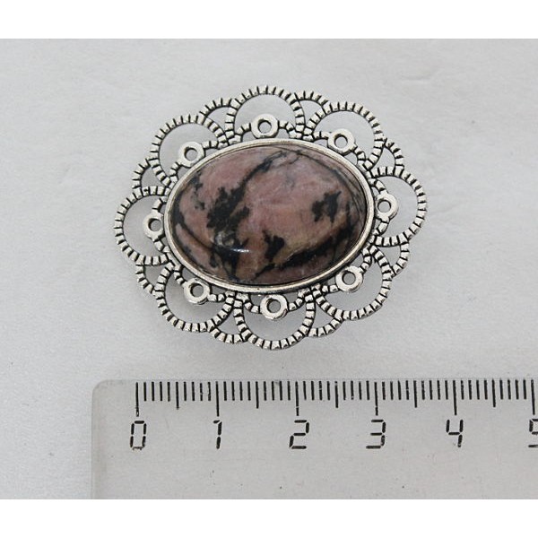 Брошь из родонита, овал 25х18мм, оправа с узором цвет бронза