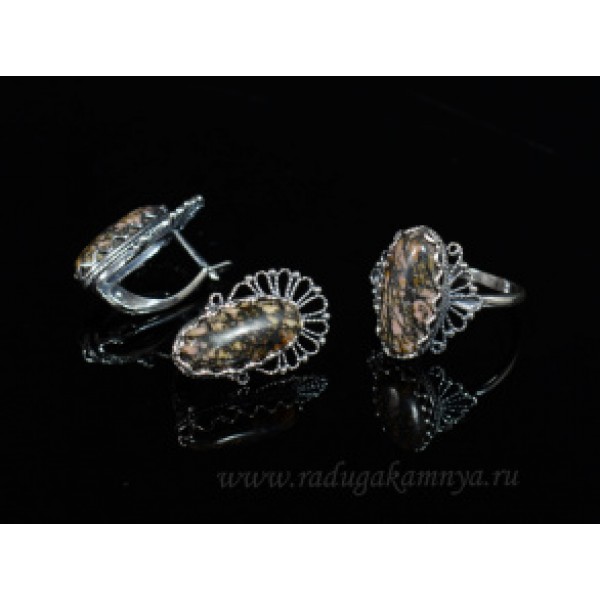 Кольцо и серьги с родонитом