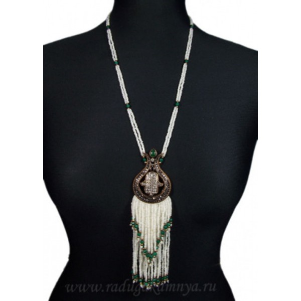 Колье из бисера с турецким мельхиором и хризопразом модель10, 76см