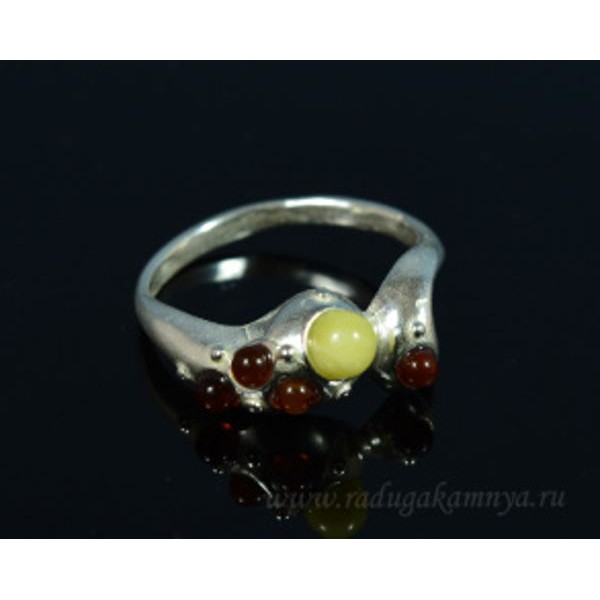 Кольцо посеребрененное с янтарём 5 шариков коньячный, молочный (иск.)