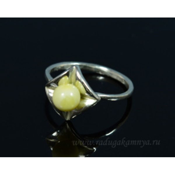 • Кольцо с янтарём в посеребрении шарик 5мм на ромбике молочный (иск.)