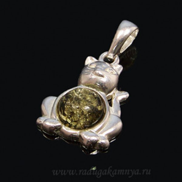 • Кулон с янтарём в посеребрении "кошка" зеленый (иск.)