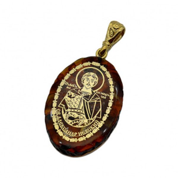 Кулон с янтарем иконка "Святой Александр Невский" овал 21*31мм. (иск.)