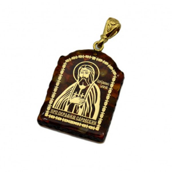 Кулон с янтарем иконка "Преподобный Серафим Саровский" арка 23*31мм. (иск.)
