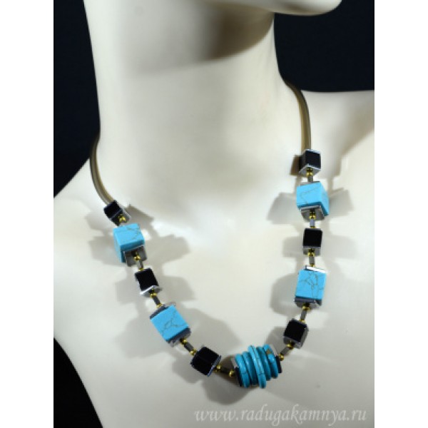 Колье на шнурке кубик с бирюзой и агатом черным 12мм , 48см