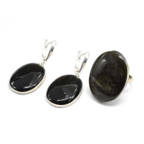 Кольцо и серьги обсидиан золотой " Овал "