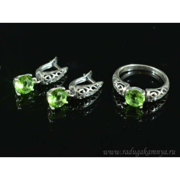 Кольцо и серьги с цирконом искусственным, цвет салатовый (иск.)