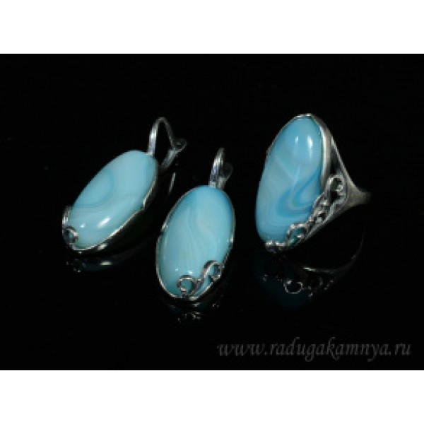 • Кольцо и серьги с агатом тонированным, цвет  свет.голубой