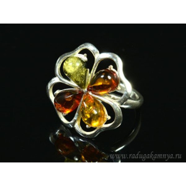 Кольцо с янтарём в посеребрении 4 лепестка 23мм ассорти (иск.)