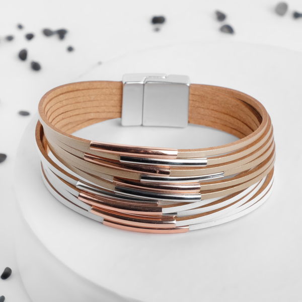 • Браслет кожа "На магните" сплошные линии с дугой, 18,5см, цвет бело-бежевый