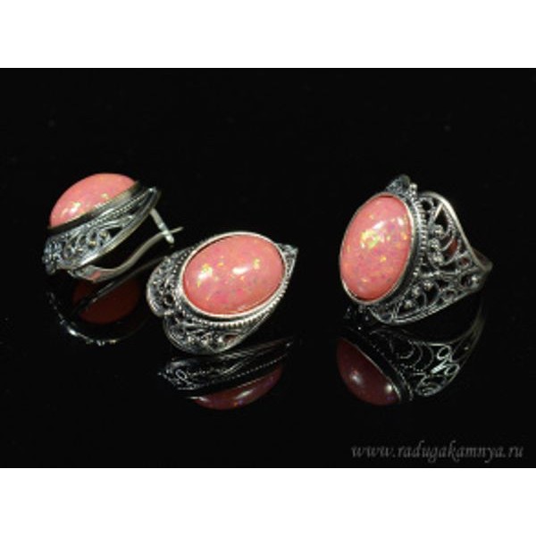 Кольцо и серьги с опалом искусственным, цвет коралловый
