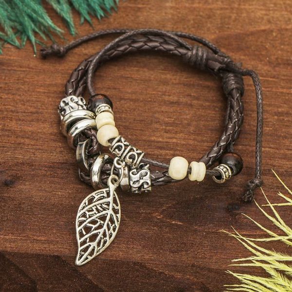 Браслет кожа "Лист" резной, 2 нити, цвет бело-коричневый