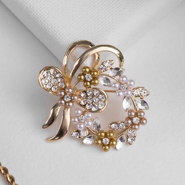 Брошь "Жемчужный венок" с бантом, цвет коричневый, цвет золотистый (пластик, стразы)