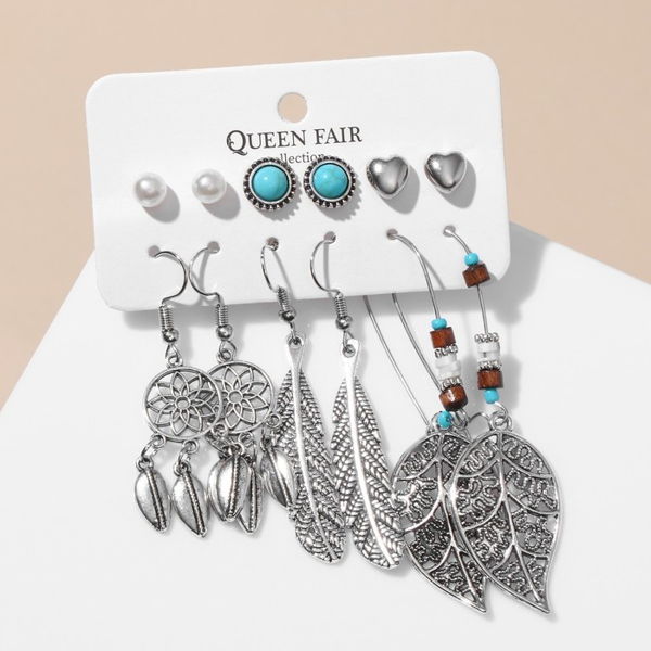 Серьги набор 6 пар "Хиппи" ловец снов, цветные, цвет серебристый