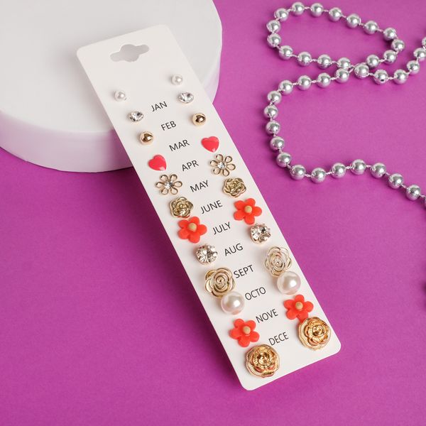Пусеты 12 пар One year, цветное ассорти, цвет бело-розовый, цвет золотистый