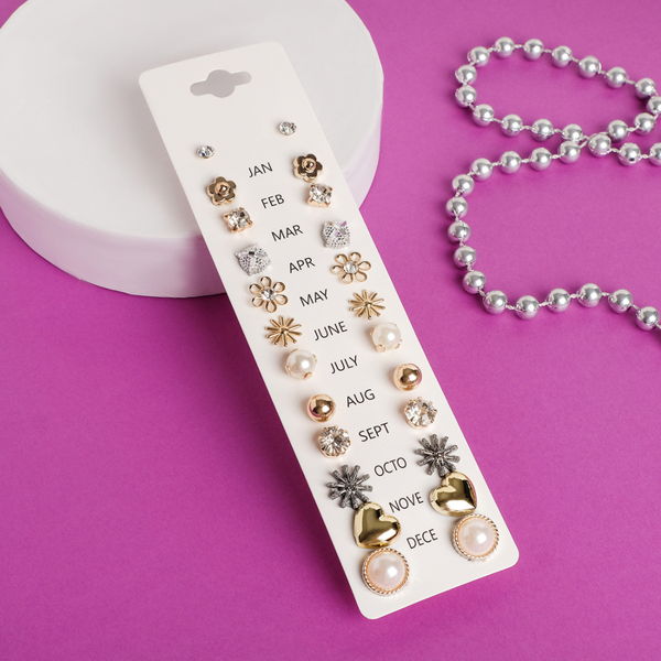 Пусеты 12 пар One year, цветочное настроение, цвет белый, цвет золотистый