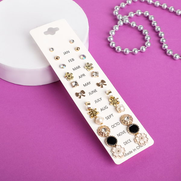 Пусеты 12 пар One year, весеннее ассорти, цвет бело-чёрный, цвет золотистый
