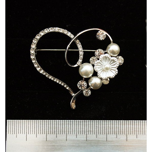 Брошь "Сердце" с жемчужинками, цвет белый, цвет серебристый (пластик, стразы)