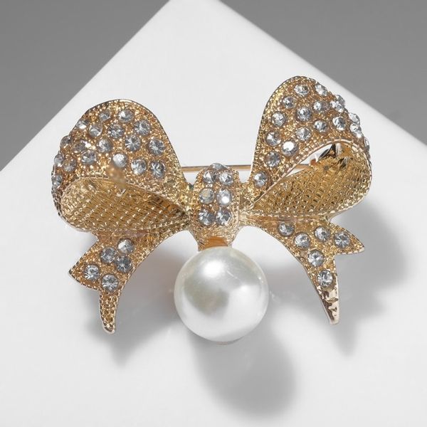 Брошь "Жемчужинка" классический бантик, цвет белый, цвет золотистый