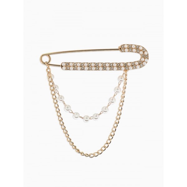 Булавка «Шик цепочки и жемчуга», в стразах, L=7.5 см, белая, цвет золотистый