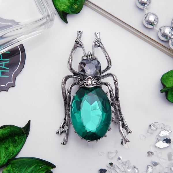 Брошь "Жужелица", цвет серо-зеленый в черненом серебре (стекло, стразы)