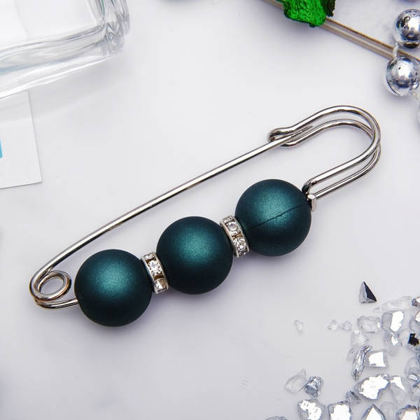 Булавка "Трио" 7см, шар №14, цвет матовый темно-зеленый, цвет серебристый (пластик, стразы, бижутерный сплав)
