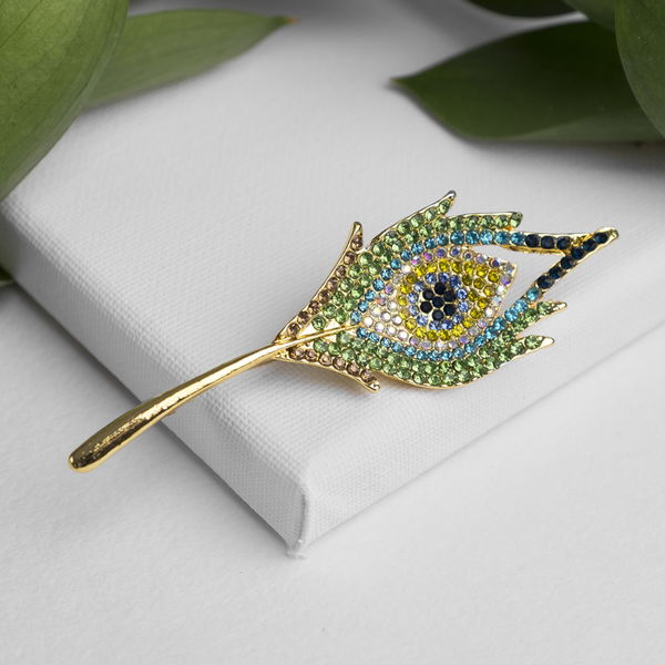 Брошь "Перо павлина", цветная , золотистый (стразы..