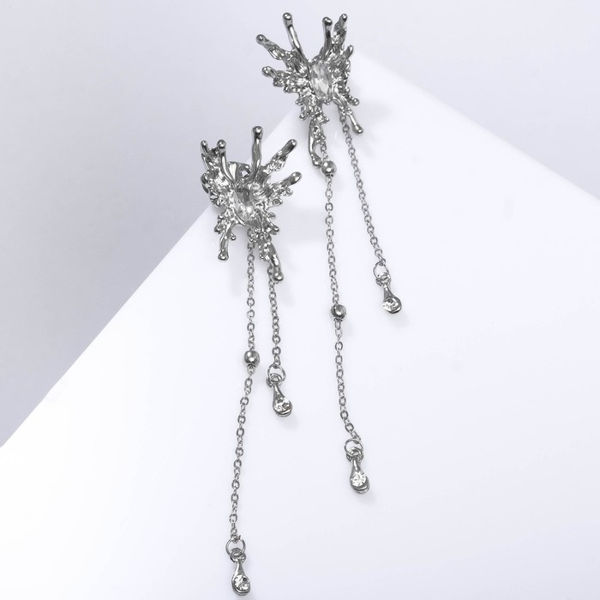 Серьги висячие со стразами "Жар-птица" с каплями на цепочке, цвет белый, цвет серебристый