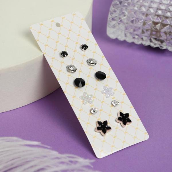 Пусеты 6 пар "Романтика" цветочки, чёрно-белый, цвет серебристый