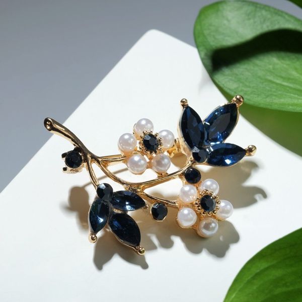 Брошь "Жемчужные цветы" со стеклянными листами, цвет бело-синий, цвет золотистый