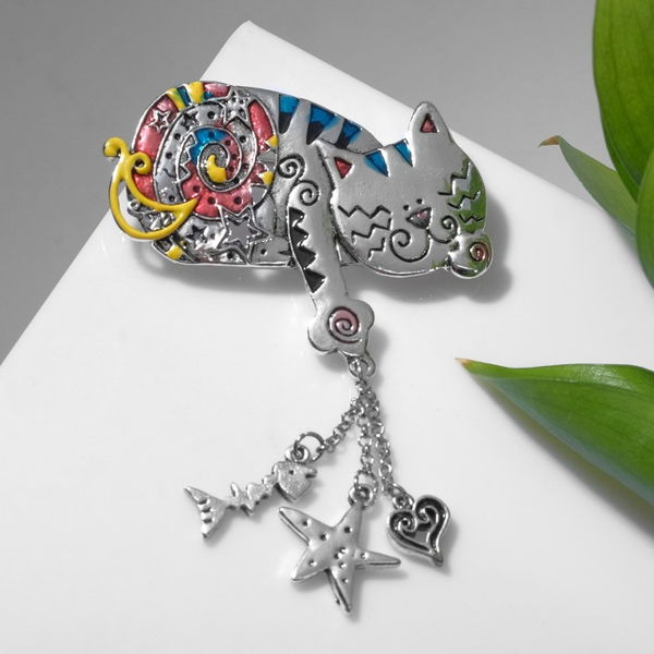 Брошь "Кот" сказочный, цветная, цвет серебристый