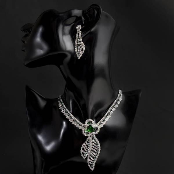 Комплект: серьги, колье "Феникс" изгиб, цвет бело-изумрудный, цвет серебристый (стразы, фианит)