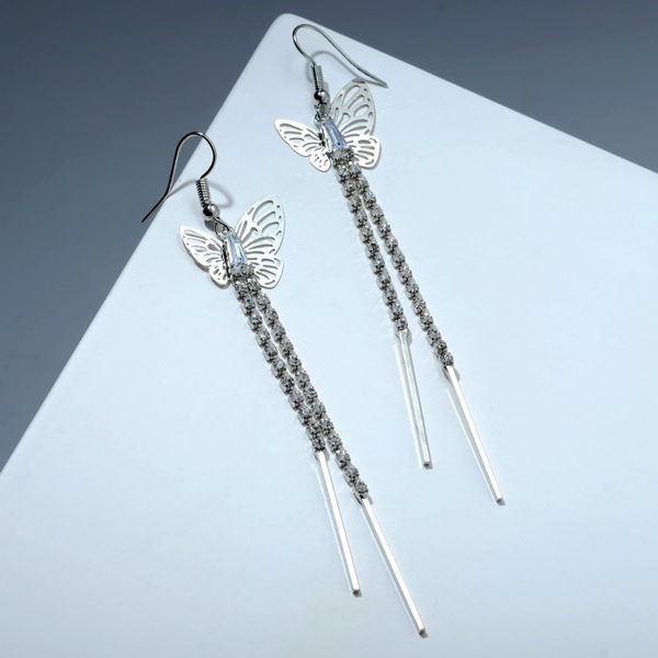Серьги висячие со стразами "Бабочки" нити, цвет белый, цвет серебристый