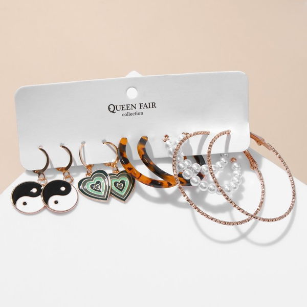 Серьги набор 5 пар "Леди" инь-ян, цветные, цвет золотистый